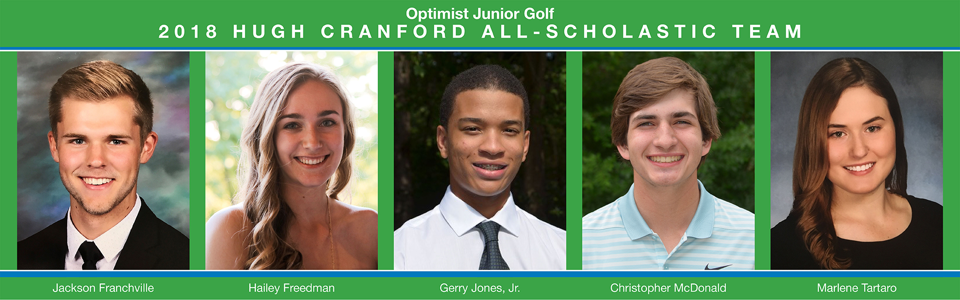 Optimist Junior Golf recently announced the junior golfers of the 2018 Hugh Cranford All-Scholastic Team. Those making the team exemplified an impressive balance of academics, golf and community service. After reviewing the qualifications of a record number of impressive applicants, the Optimist Junior Golf Committee selected the following exceptional student athletes for the team: