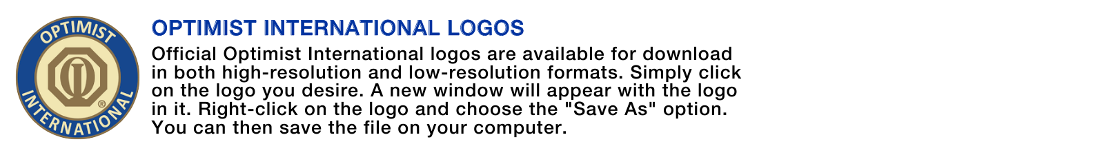 To learn more about how to properly use the Optimist logos, please read the Branding Guidelines. The use of Optimist International logos and trademarks may only be used for purposes approved by the Optimist International Board of Directors under official Board policy. Please review the "Use of Trademarks and Service Marks" policy by clicking here. Note: Low-resolution files are perfect for web or e-mail uses, particularly for newsletters and websites. They download quickly. High-resolution files are required for offset printing and/or silk screening. However, these files are larger and take additional time to download. Many printers request vector art files (or .eps files). If you are in need of a vector art file, please click here to make a request by e-mail. |